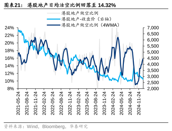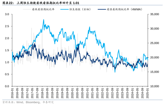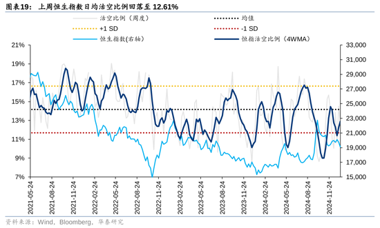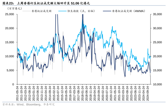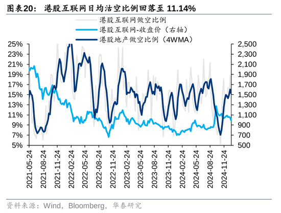 神情规划上:1)估值与风险溢价:上周恒生指数PETTM络续更正,风险溢价(相对好意思债)小幅回升至6.73%,处于飘浮5年均值隔壁。2)空头头寸:上周恒生指数日均沽空比例回落,仍处于中性水位。单日来看,上半周高位回落,周四至周五再次回升至接近15%。其中,港股互联网沽空比例回落至11 %,港股地产沽空比例回落至14%。此外,近期空头交游量上行与成交额占比的背离响应不同类型的投资者不对加重。3)上周恒生指数看跌看涨期权比率回升至1.01,短期悲不雅神情计入较充分;4)上周香港繁衍权证成交额和占主板成交比重均回升。