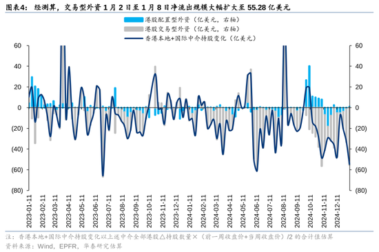交游型外资净流出畛域扩大。以Wind统计的香港腹地及国际中介抓股变化估算流量(同样代表港股外资流量),与EPFR口径下港股竖立型外资流量的差值,同样代表港股的交游型外资,1月2日至1月8日净流出畛域大幅扩大至55.28亿好意思元(vs 前一周净流出31.70亿好意思元)。