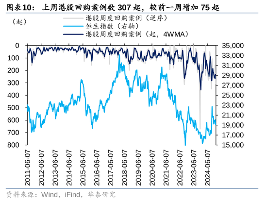 上周港股市集回购热度大幅回升:上周回购案例数307起,较前一周加多75起;回购额98.03亿港元,较前一周加多41.85亿港元,回购市值比回升至万分之1.94;上述规划均创2024年9月下旬以来新高,并位于2023年以来90%分位数以上。