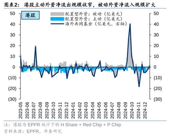 1月2日至1月8日,以EPFR口径统计的竖立型外资转为净流入港股,ADR净流入畛域收窄。竖立盘,港股主动外资畅达13周净流出,但净流出畛域收窄,被迫外资净流入畛域扩大。交游盘,咱们测算的交游型外资净流出畛域大幅扩大。竖立盘和交游盘的不对或响应不同类型的投资者格调进一步分化:一方面,跟着外资对港股的竖立力度降至2020年以来低位,主动竖立型外资净流出港股放缓,或响应港股估值已更正至合理区间;另一方面,交游盘净流出畛域扩大,功绩预报密集透露期和特朗普1月20日细致就任潜在的外部战略扰动下,部分投资者提前避险。