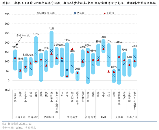 考试AH溢价2010年以来分位数,死心1月13日轻工/消耗者处事/食饮/银行/钢铁等处于高位,传媒/家电等降至低位。
