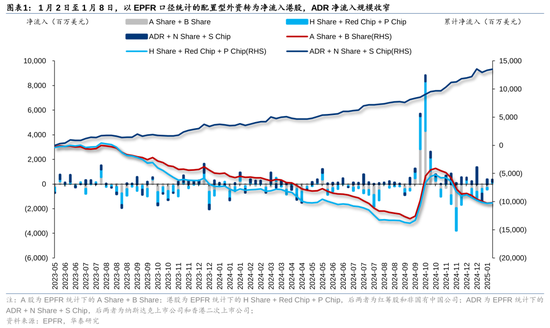 1月2日至1月8日,以EPFR口径统计的竖立型外资转为净流入港股,ADR净流入畛域收窄。其中,竖立型外资净流入港股0.81亿好意思元(vs前一周净流出1.40亿好意思元),净流入ADR畛域收窄至1.79亿好意思元(vs前一周净流入3.88亿好意思元)。