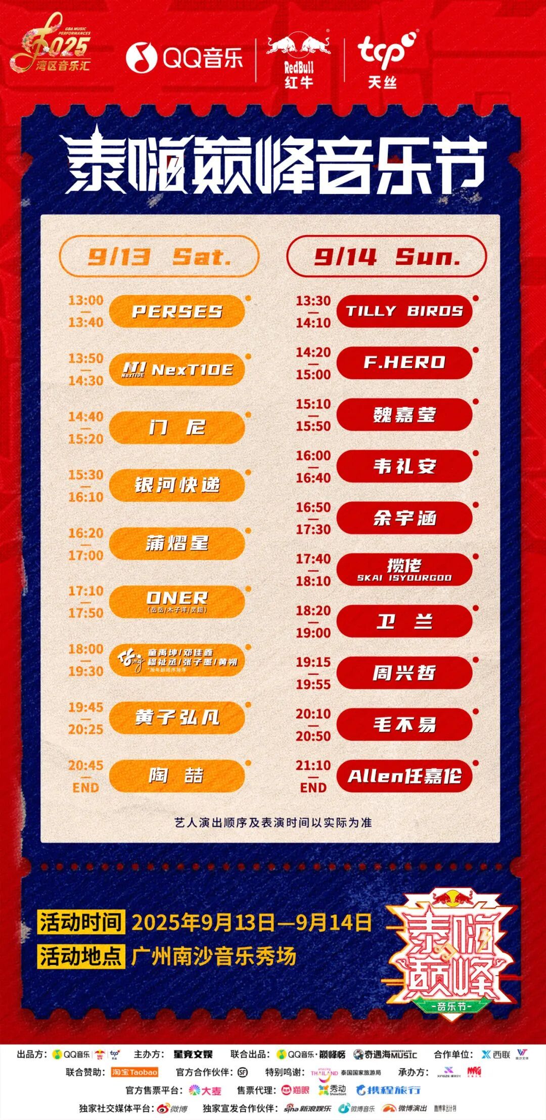 在2025年9月8号-14号上演当周,可凭泰嗨巅峰音乐节购票信息在南沙天后宫、南沙水鸟寰宇生态园、南沙湿地公园三大景区享受门票八折优惠。