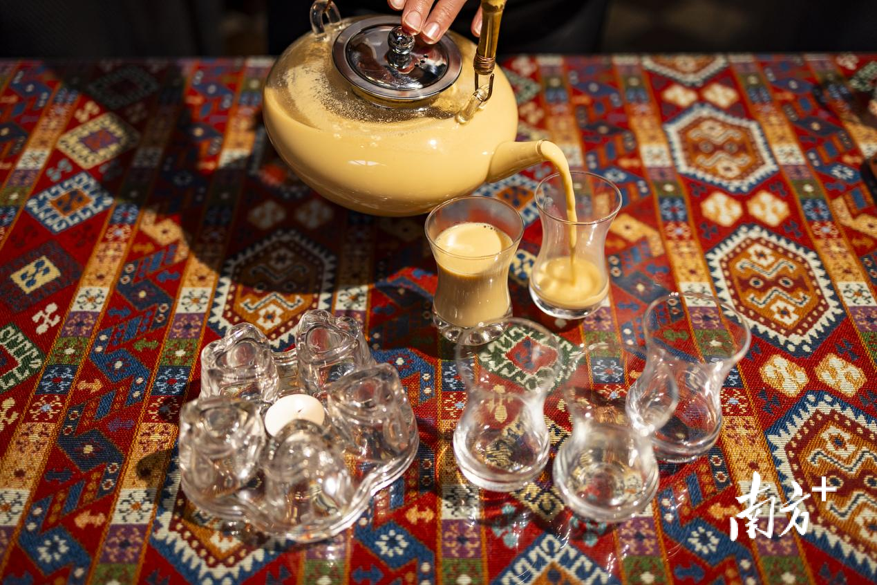 疏附牛奶,不啻于鲜。冰川融水灌溉的牧草,养出的奶牛产奶自带清甜。刚挤的鲜奶倒进碗里,是贞洁的乳白色,莫得一点千里淀,带着草原气味,抿上一口,像把春天的露珠含在了嘴里。这份鲜,最妙的是百搭。不管是泡馕、作念奶茶,还是泡麻花,都能给另一种食材增添风范。